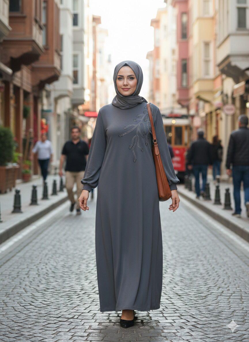 Makruba Taş Baskı Elbise - Gri (ELB000255)
