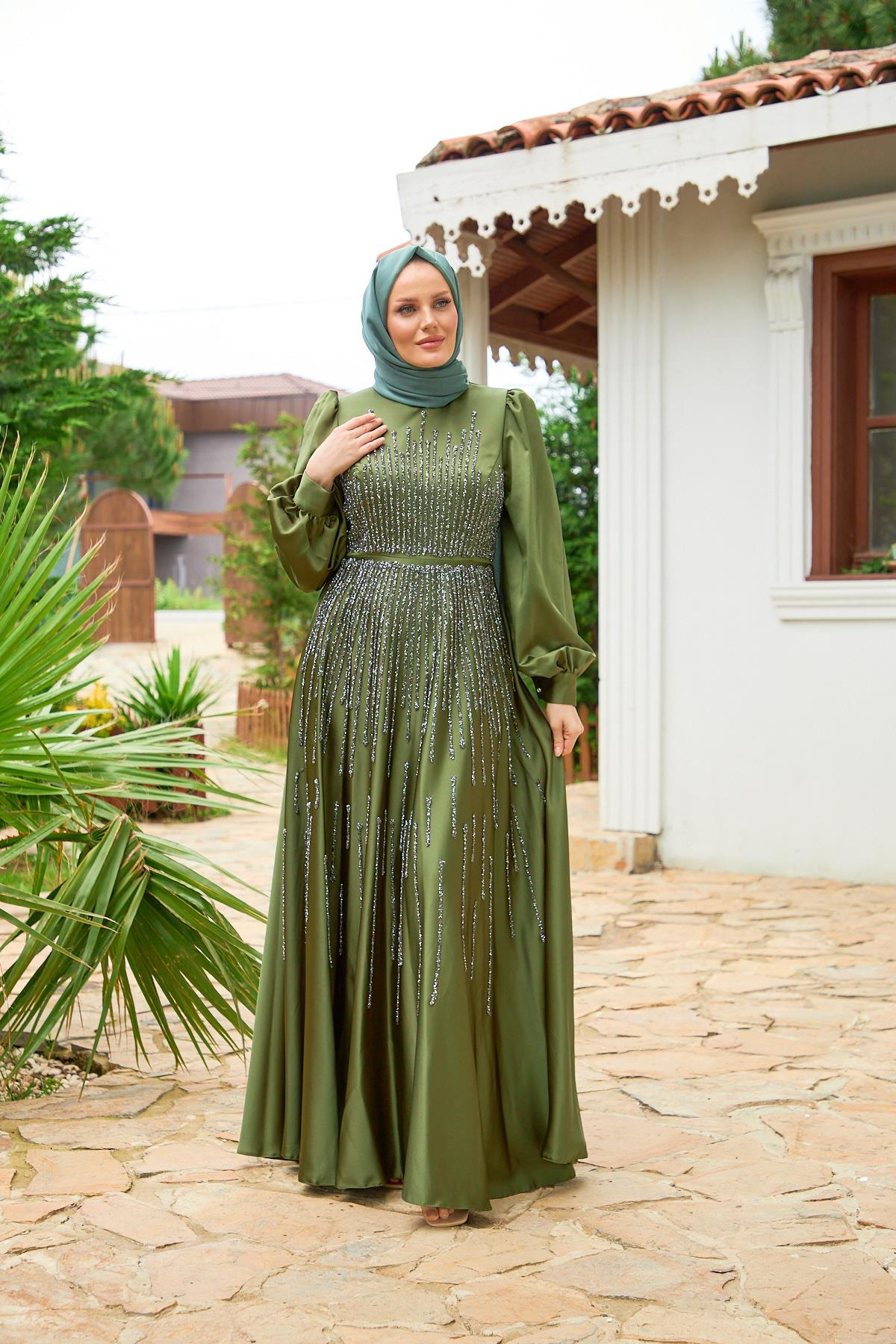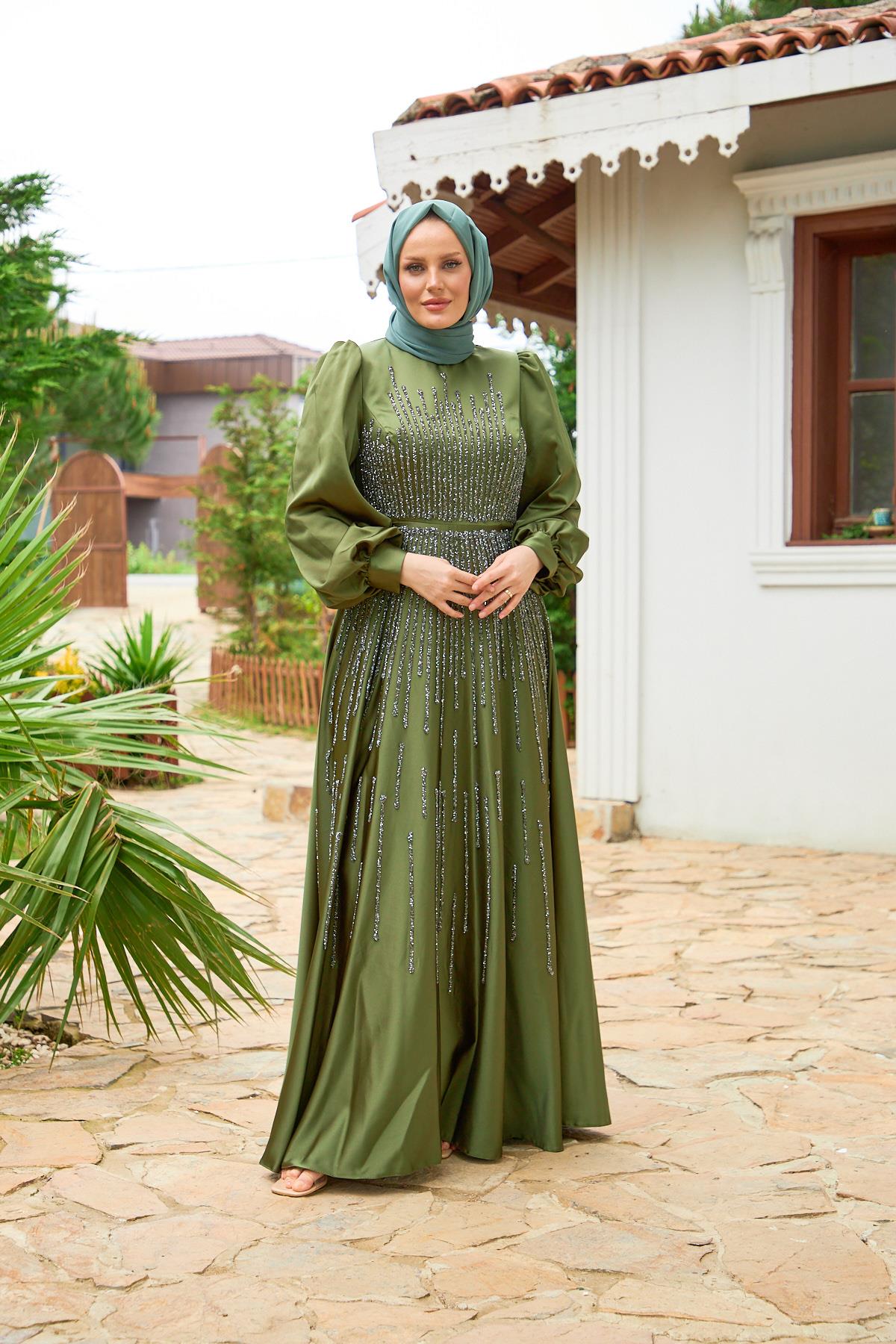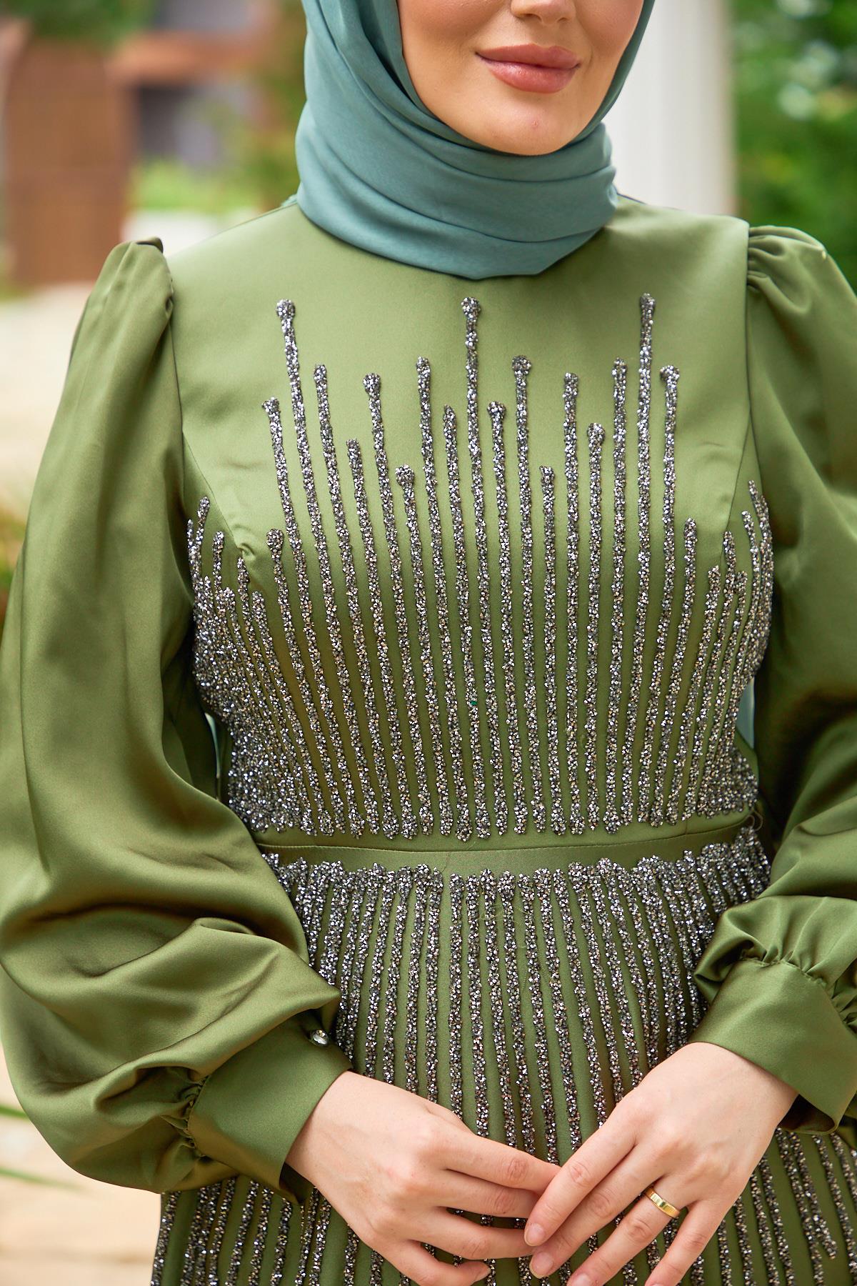 Önü Düz Çizgi Taşlı Elbise - Haki (ABY000416)