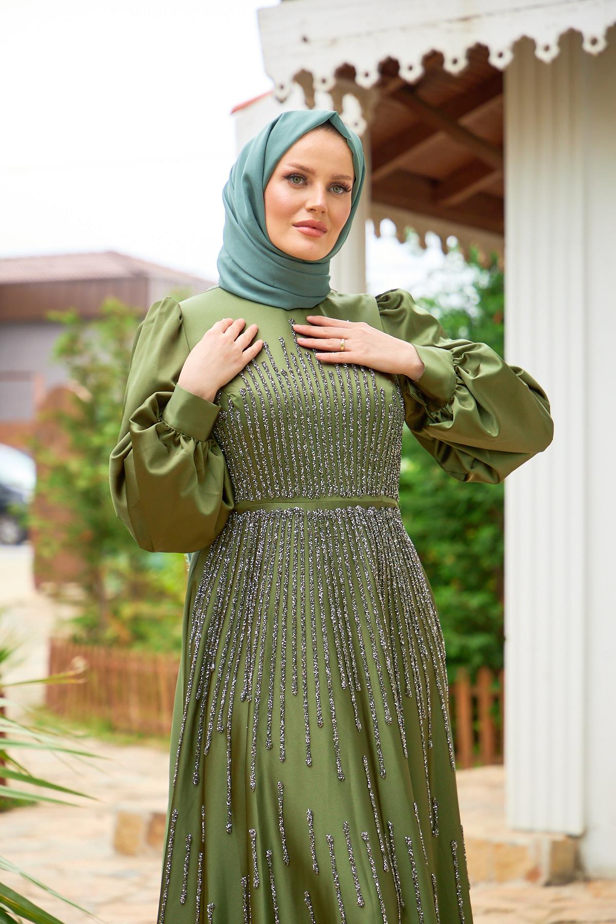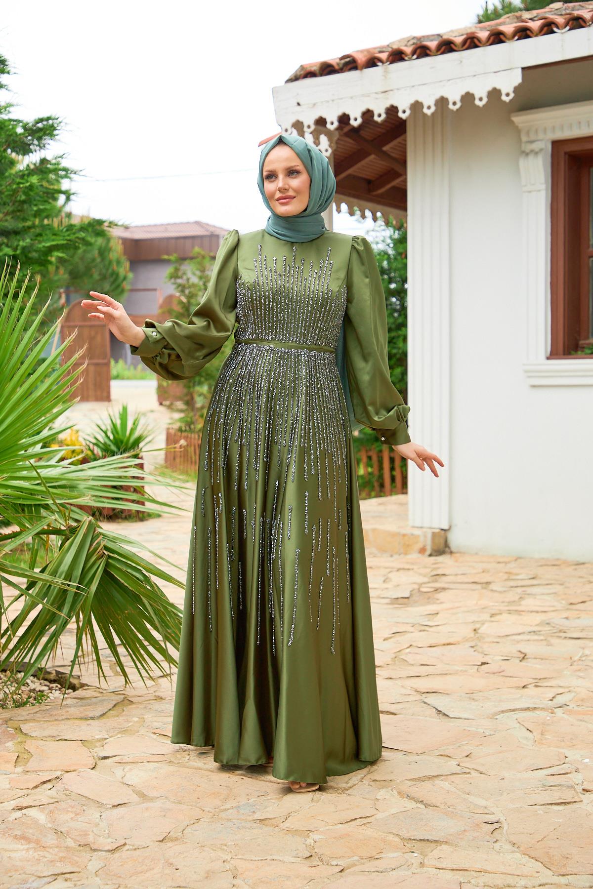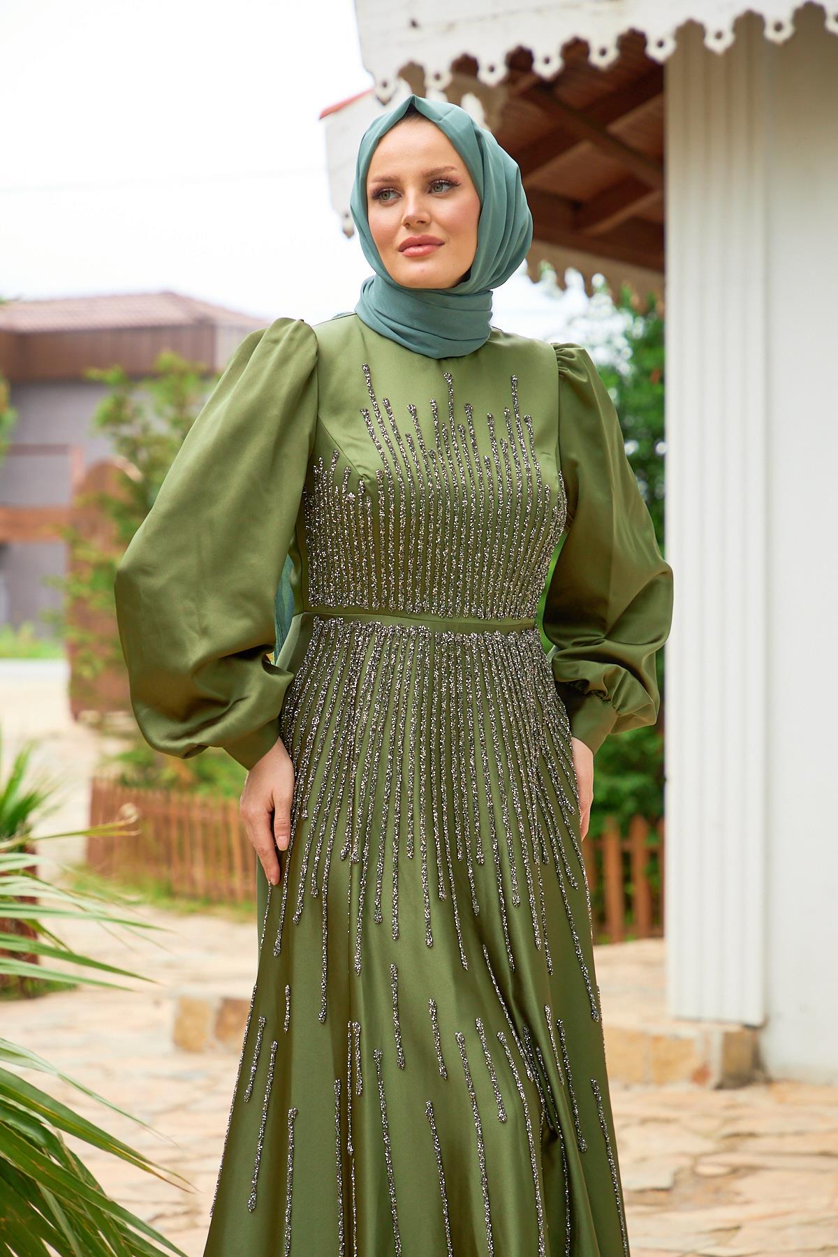 Önü Düz Çizgi Taşlı Elbise - Haki (ABY000416)