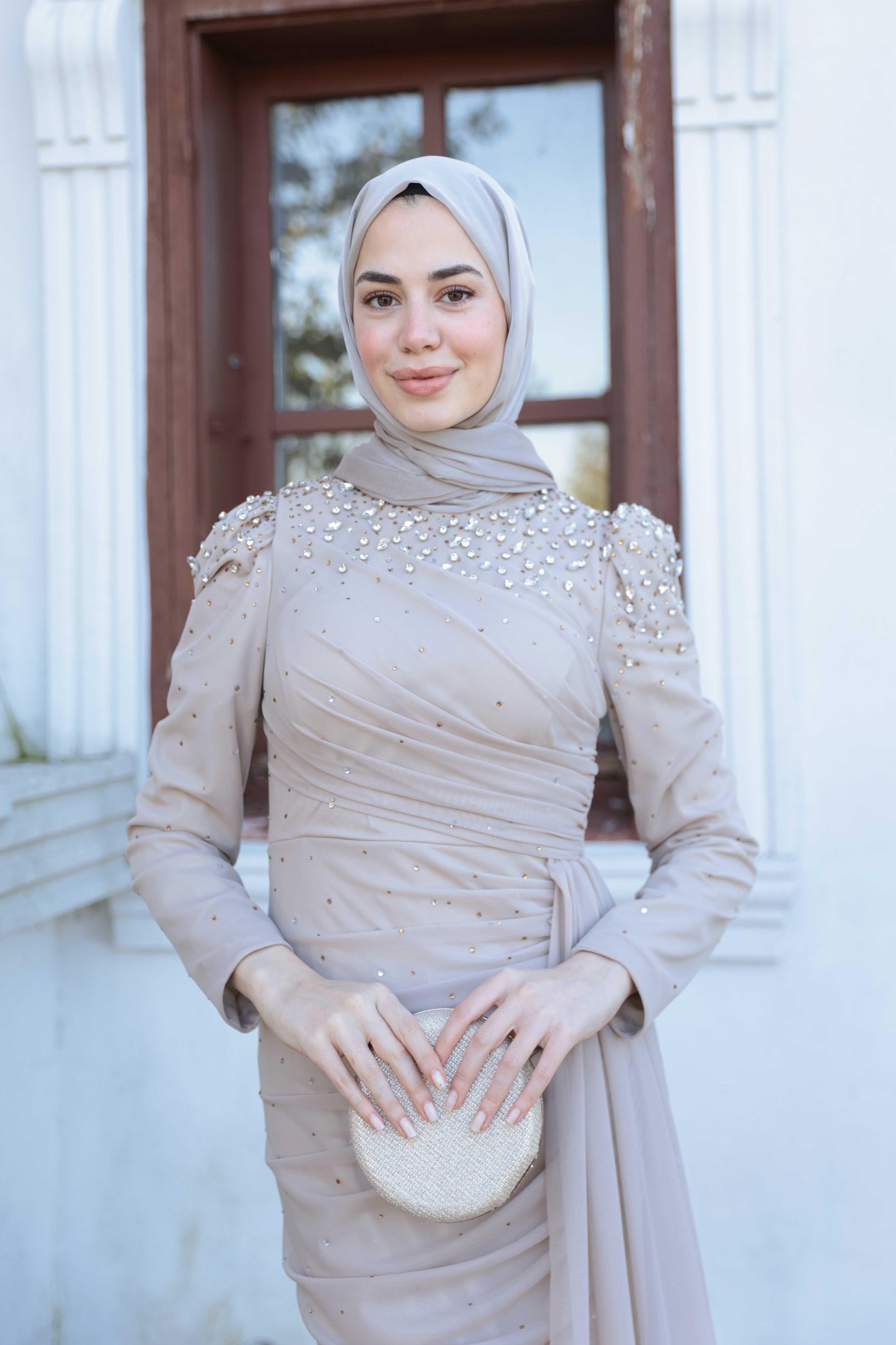 Tül Taş İşleme Abiye - Bej (ABY000573)